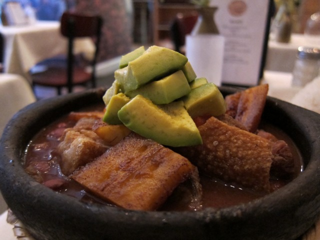 Anyway, after self-seasoning with the above we definitely enjoyed our choice from the "Sopas Colombianas" section of the Dulce Vida menu, the Ajiaco. This was an almost stew-like concoction of potatoes, shredded chicken, capers and a dollop of cream, which, after adding in the half avocado and a mound of white rice, made for a comforting, hearty dish. Also hearty (and also needing previously suggested seasoning) was our Cazuela de Frijoles, a casserole of red beans, sweet platanos, avocado, and "chopped chicharron", which wasn't the crackling fried pig skin we were expecting–more like large, difficult-to-navigate hunks of skin, meat, fat, bone–but, once we figured it out, was good nonetheless. Dulce Vida Bakery usually serves one of our all-time favorite desserts, Tres Leches cake, but were sold out on this night. Maybe next time–or a guava paste goodie? or some flan, quizas? All of which should be paired with a cup of their first-rate Columbian coffee.
