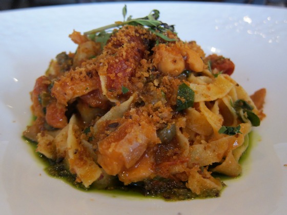The 83 1/2 menu has an appealing Stuzzicare section, with a special of any three snacks for only $13. Clearly this is the way to go, and I was rewarded with three-out-of-three winners: a fat, crispy pair of tomato risotto fritters, studded with oxtail and just the right hint of sweetness; a small pile of soft poached tuna drizzled in olive oil and paired with grilled ramps; and a mound of fluffy ricotta accompanied by a thick, pesto-ish sauce. Both of these last two came with oily toast which, when combined with the first-rate bread basket, red pepper spread and (more) olive oil, all makes for a snappy start to a meal.
